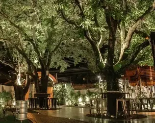 Naturaleza viva con pinceladas de paisajismo, destacada por un buen diseño de iluminación, es lo que encontrarás en el patio cervecero más grande de Bolivia.