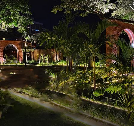 Naturaleza viva con pinceladas de paisajismo, destacada por un buen diseño de iluminación, es lo que encontrarás en el patio cervecero más grande de Bolivia.